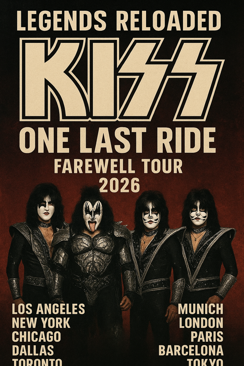 For more than five decades, KISS has reigned as one of rock’s most electrifying forces — a band that transformed theatrical performance, pyrotechnics, and shock-rock spectacle into a worldwide cultural phenomenon. Now, in a moment both bittersweet and monumental, the legendary group has officially announced their 2026 Farewell Tour, appropriately titled “One Last Ride.” This final run marks the closing chapter of a musical legacy that has influenced generations and redefined what it means to be a rock icon.