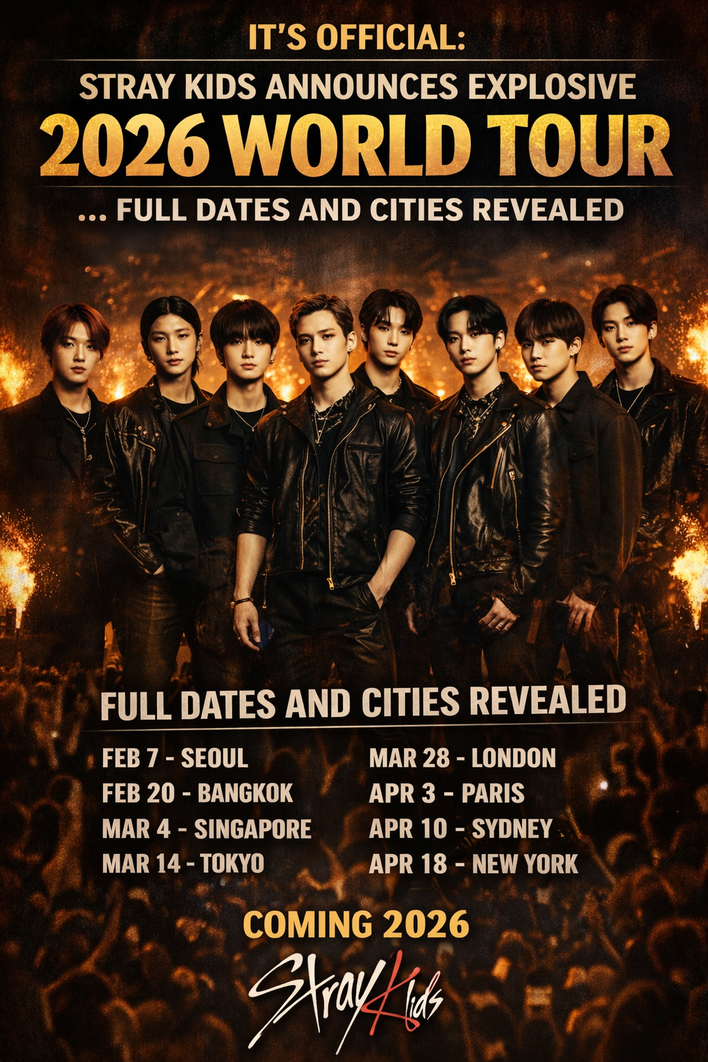 The wait is finally over for STAYs around the world. Global K-pop powerhouse Stray Kids has officially announced their 2026 World Tour, igniting massive excitement across the music industry and fan communities worldwide. Known for their high-energy performances, genre-defying sound, and unmatched stage presence, Stray Kids are set to deliver what many are already calling one of the biggest and most explosive tours of 2026.